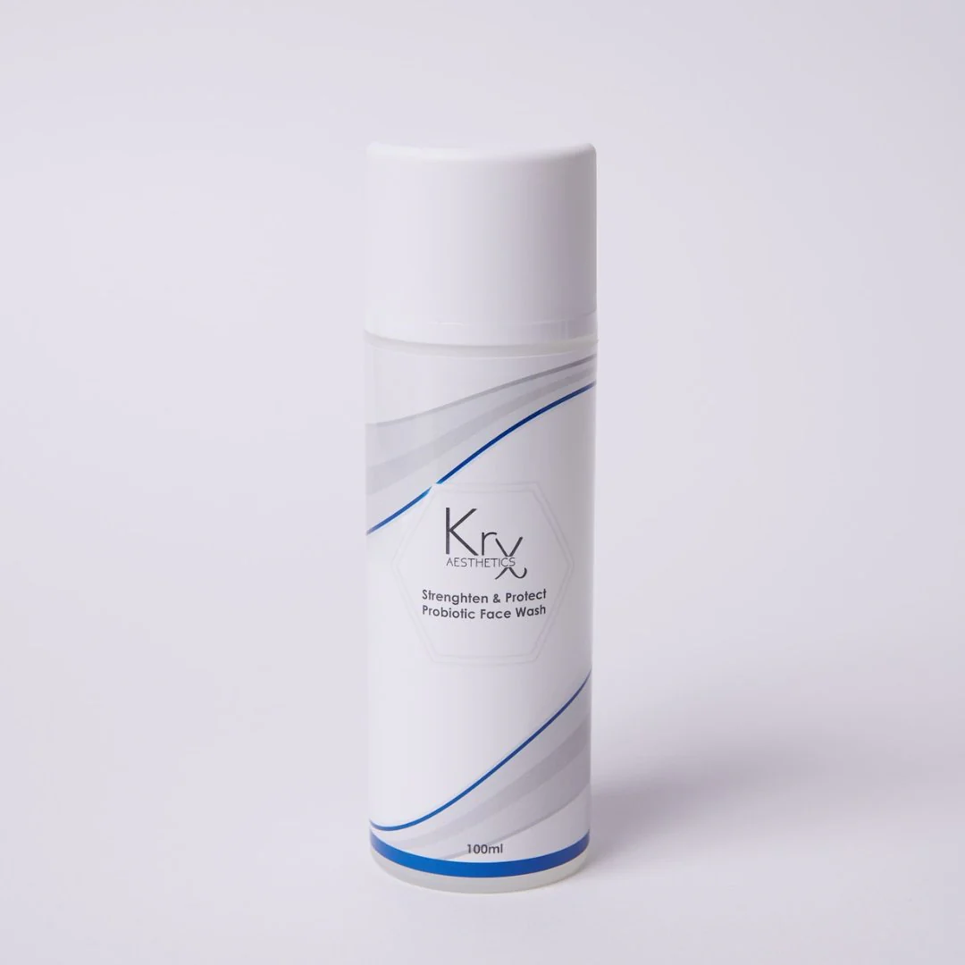 KrX Strengthen + Protect Probiotic Face Wash cleanses the skin and balances the microbiome with a unique blend of probiotics and botanicals.